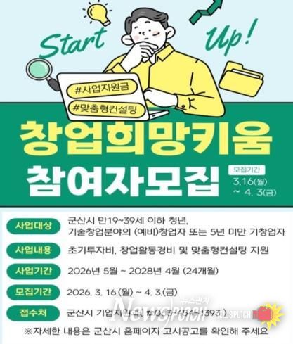 뉴스펀치 정홍균 기자 | 군산시는 혁신적인 청년 창업가를 발굴하고 사업정착을 지원하기 위한 ‘창업 희망키움사업(8기)’에 참여할 청년 (예비)창업가를 4월 3일까지 모집한다고 밝혔다.
