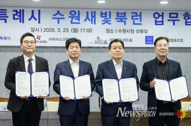 수원시와 ㈜아이스크림에듀, (사)씨드(Seed)숲, 수원시서점협동조합은 23일 시청 상황실에서 ‘수원새빛북런(Book Learn) 업무협약’을 체결하고, 협력을 약속했다.