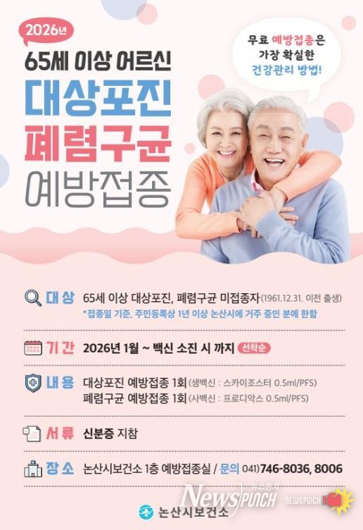 접종 대상은 접종일 기준 논산시에 1년 이상 주민등록을 둔 만 65세 이상(1961년 이전 출생자) 시민으로, 기존 접종 이력이 있거나 백신 금기자는 제외된다.