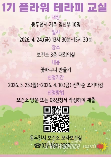 이번 플라워테라피 태교 교실은 4월 24일 보건소 3층 대회의실에서 진행하며 신청 기간은 오는 10일까지로 동두천시 보건소에 등록된 임신부를 선착순 모집한다.