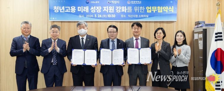 익산시는 고용노동부 익산지청, 원광대학교와 함께 24일 시청에서 '청년고용 미래 성장 지원 강화를 위한 업무협약'을 체결했다.