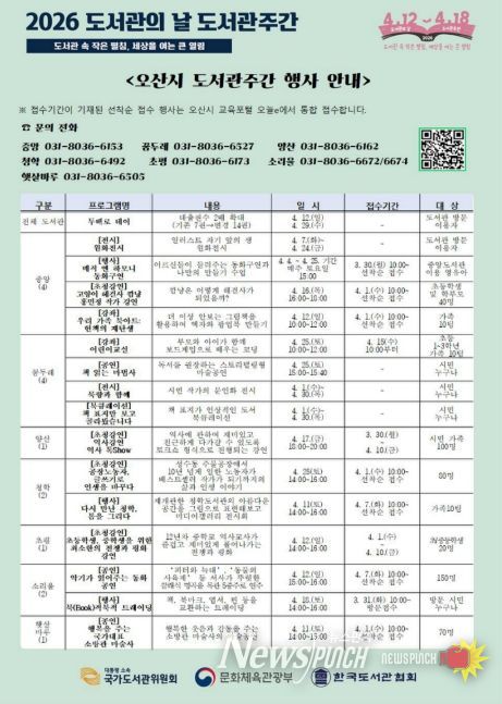 뉴스펀치 박상훈 기자 | 오산시는 2026년 도서관의 날(4월 12일)과 도서관주간(4월 12일~4월 18일)을 맞아 시민 누구나 참여할 수 있는 다양한 독서문화 행사를 운영한다고 밝혔다.
