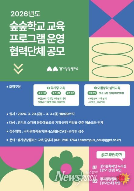뉴스펀치 박상훈 기자 | 경기문화재단 경기상상캠퍼스는 3월 20일부터 4월 3일 16시까지 2026 경기상상캠퍼스 ‘숲숲학교’ 교육 협력단체를 공개 모집한다.