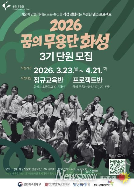 뉴스펀치 박상훈 기자 | (재)화성시문화관광재단은 지역 내 아동·청소년의 문화예술 향유를 위한 예술교육 프로그램 ‘2026 꿈의 무용단 화성’의 단원을 오는 3월 23일부터 4월 21일까지 모집한다고 밝혔다.