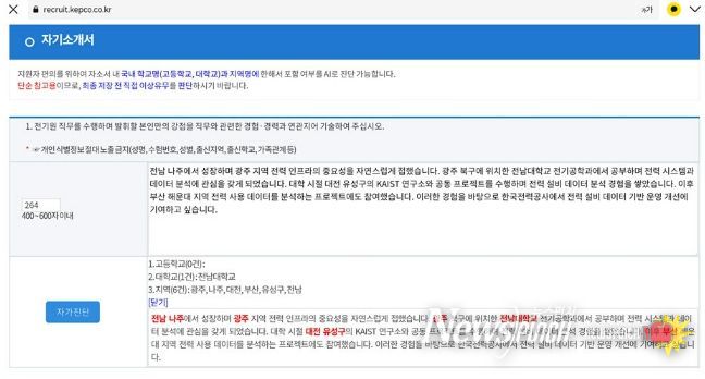 뉴스펀치 김용희 기자 | 한국전력이 채용 지원자의 편의를 높이고 공정한 채용 환경을 조성하기 위해, 자기소개서 AI 자가 진단과 네이버 인증 기반 자격증 자동 반영 서비스를 채용 시스템에 전격 도입한다.