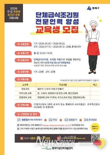 뉴스펀치 김윤걸 기자 | 부산 동래구와 동래여성인력개발센터(센터장 이숙련)는 지역 내 50세 이상 장노년을 대상으로 구·군 맞춤형 일자리 창출 지원사업인 ‘단체급식조리원 전문 인력 양성 과정’ 참여자를 모집한다고 24일 밝혔다.