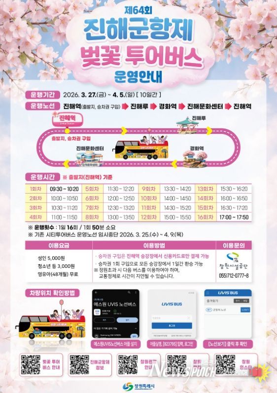 뉴스펀치 박세훈 기자 | 창원특례시는 오는 3월 27일부터 4월 5일까지 열흘간 제64회 진해군항제와 연계한 ‘벚꽃 투어버스’ 특별 노선을 운영한다.
