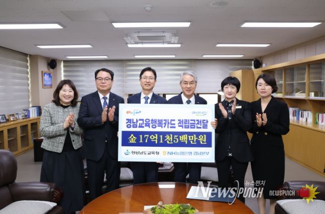 뉴스펀치 박세훈 기자 | 경상남도교육청은 24일 NH농협은행으로부터 ‘경남교육행복카드’ 사용으로 적립된 포인트 17억 1,585만 6,930원을 전달받았다.