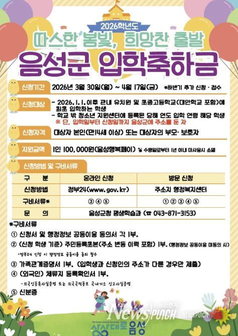 뉴스펀치 이현승 기자 | 음성군은 올해 2026학년도 입학을 맞아 관내 유치원과 초·중·고등학교 입학생, 그리고 학교 밖 청소년지원센터에 등록된 입학 연령에 해당되는 청소년을 대상으로 입학축하금을 지원한다고 밝혔다.