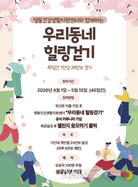 뉴스펀치 이현승 기자 | 충북 음성군 맹동건강생활지원센터는 주민들의 걷기 실천율을 높이고 비만, 우울, 고혈압 등 기저질환 관리를 돕기 위해 오는 4월부터 ‘우리동네 힐링걷기’ 챌린지를 운영한다.