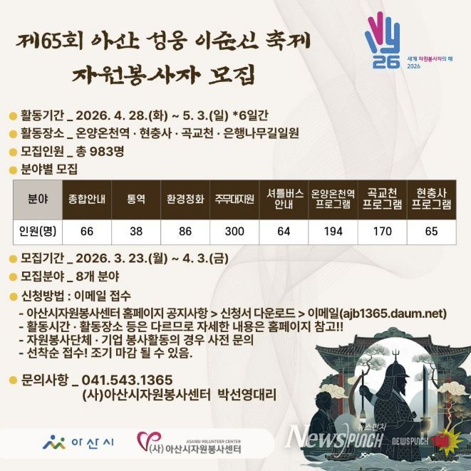 뉴스펀치 이현승 기자 | (사)아산시자원봉사센터는 3월 23일부터 4월 3일까지 ‘제65회 아산 성웅 이순신축제’의 원활한 운영을 위해 자원봉사자 983명을 모집한다고 밝혔다.