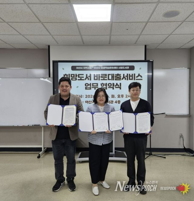 뉴스펀치 이현승 기자 | 아산시 시립도서관은 24일 우리서점, 탕정서점과 ‘희망도서 바로대출’ 서비스 운영을 위한 업무협약을 체결했다고 밝혔다.