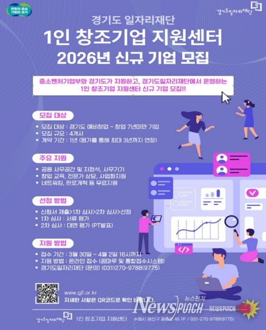 뉴스펀치 박상훈 기자 | 경기도일자리재단은 창업자와 예비 창업자에게 사무공간과 사업화를 지원하는 ‘1인 창조기업 지원센터’ 참여기업을 30일부터 모집한다.