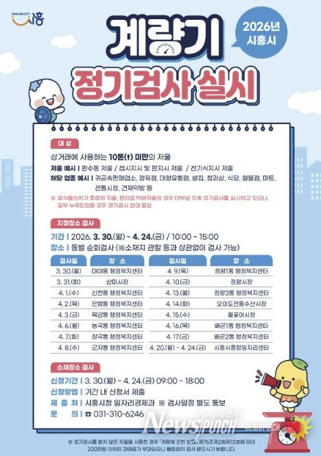 뉴스펀치 박상훈 기자 | 시흥시는 공정한 상거래 질서 확립과 소비자 권익 보호를 위해 오는 3월 30일부터 4월 24일까지 ‘2026년 계량기(저울) 정기 검사’를 실시한다.