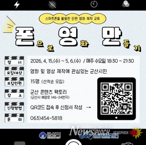 뉴스펀치 정홍균 기자 | 군산콘텐츠팩토리가 4월 15일부터 5월 6일까지, 매주 수요일 총 4회차에 걸쳐 단편영화 제작 교육 프로그램 ‘폰.영.만.(폰으로 영화 만들기)’을 운영한다.