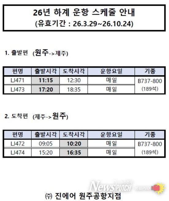 뉴스펀치 조평훈 기자 | 원주공항의 2026년 하계(3월 29일∼10월 24일) 제주 항공편이 동계와 같이 오전·오후 시간대 편성으로 유지된다.