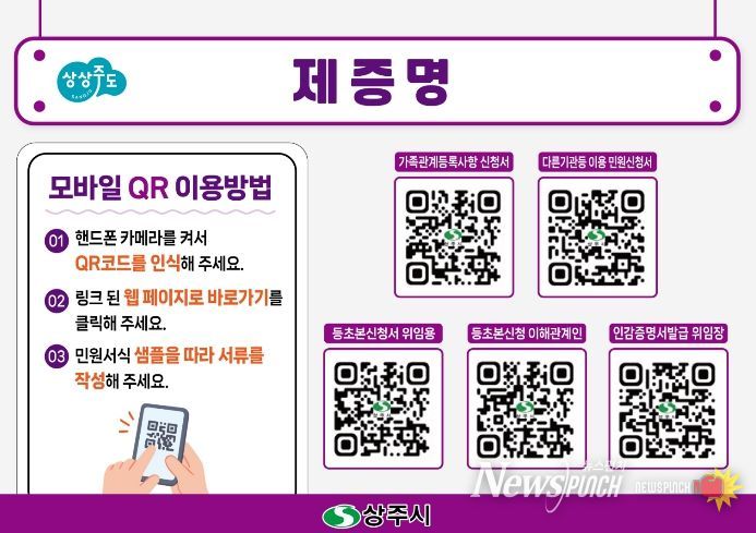뉴스펀치 박세훈 기자 | 상주시는 민원서식 작성에 어려움을 겪는 시민들의 불편을 해소하고 민원 처리의 편의성을 높이기 위해 QR코드를 활용한 ‘민원서류 작성 예시 안내 서비스’를 도입한다고 밝혔다.
