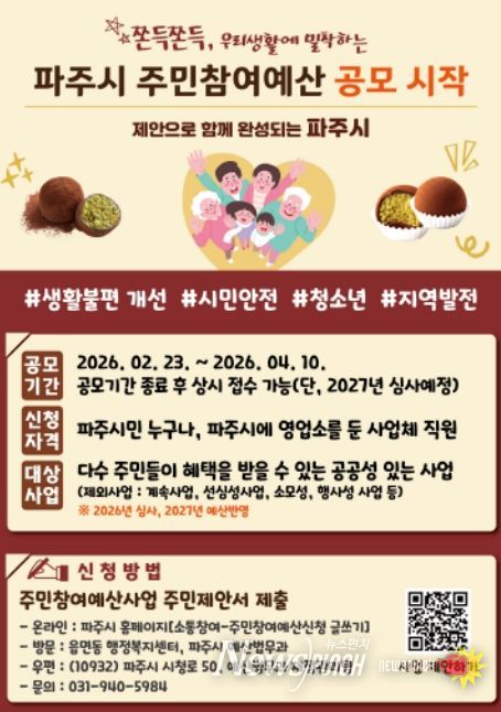 뉴스펀치 박상훈 기자 | 파주시는 2027년도 예산 편성에 반영할 주민참여예산 시민 제안을 오는 4월 10일까지 접수한다.