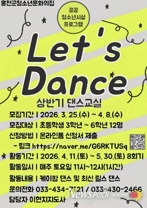뉴스펀치 조평훈 기자 | 홍천군청소년문화의집은 지역 내 초등학생 3학년부터 6학년까지의 청소년을 대상으로 공공 청소년시설 프로그램 “댄스 교실 Let’s Dance” 상반기 참가자를 모집한다.