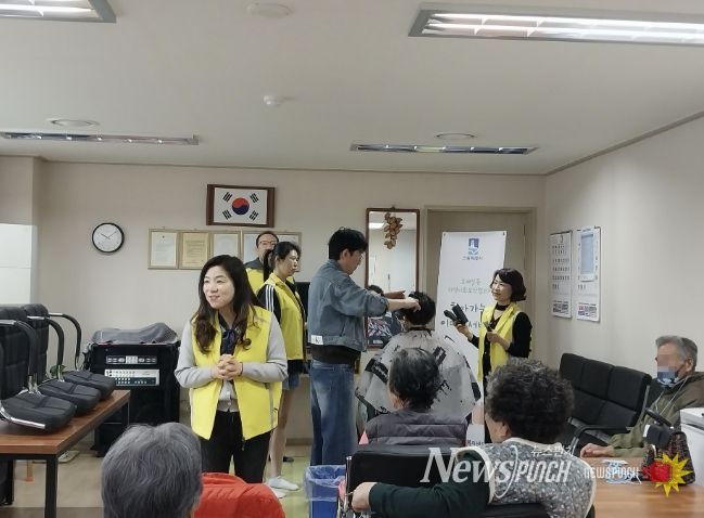 이날은 순서를 기다리시는 어르신들을 대상으로 건강체조도 알려드리며 화기애애한 분위기에서 진행됐다. 또한 경로당에서 뿐만 아니라 거동이 불편한 어르신 가정에도 방문하여 총 14명의 어르신들에게 이미용 서비스를 제공했다.