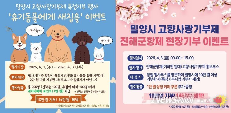 먼저, 밀양시는 특정기부 사업인 ‘유기동물 입양 지원’의 기부율을 제고하기 위해 오는 4월 1일부터 30일까지 ‘유기동물에게 새집을’ 이벤트를 진행한다.