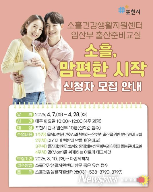 뉴스펀치 박상훈 기자 | 포천시 소흘건강생활지원센터는 임산부의 건강한 임신과 안전한 출산을 지원하기 위해 임산부 출산준비교실 ‘소흘, 맘편한 시작’ 참여자를 모집한다.