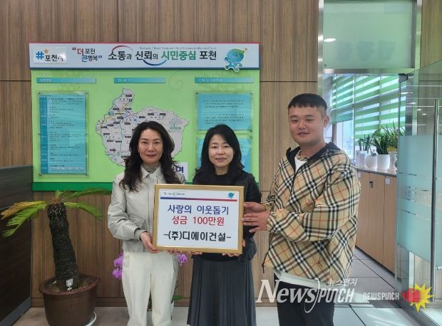 뉴스펀치 박상훈 기자 | 포천시 신읍동 소재 ㈜디에이건설은 지난 24일 지역 내 어려운 이웃을 돕기 위해 가산면 행정복지센터에 성금 100만 원을 기탁했다.