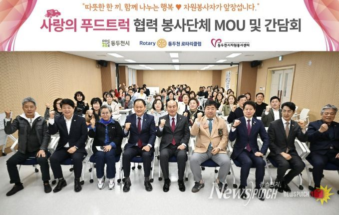 뉴스펀치 박상훈 기자 | 동두천시자원봉사센터는 지난 24일 생연공유누리센터 강당에서 12개 자원봉사단체와 동두천 로타리클럽이 참여한 가운데 ‘사랑의 푸드트럭’ 운영 활성화를 위한 업무협약(MOU)과 간담회를 개최했다.