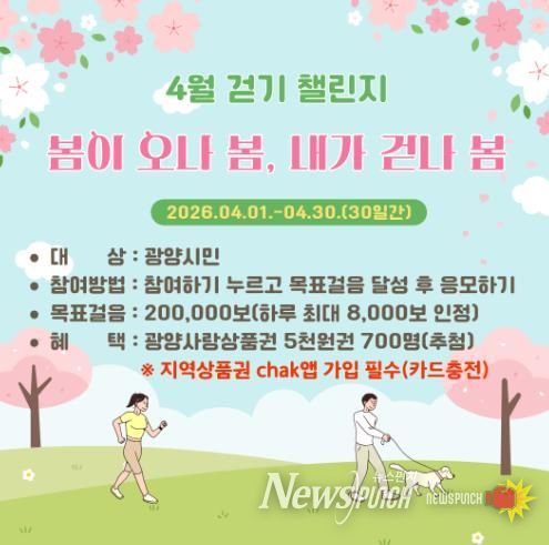 뉴스펀치 최영남 기자 | 광양시는 오는 4월 1일부터 4월 30일까지 건강걷기 실천 모바일 걷기앱 워크온을 통해 ‘봄이 오나 봄, 내가 걷나 봄! 4월 걷기 챌린지’를 운영한다고 밝혔다.