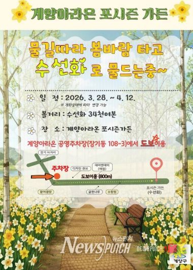 뉴스펀치 정홍균 기자 | 인천광역시 계양구는 봄을 맞아 계양아라온 일대에 대규모 꽃 식재를 완료하고, 포시즌가든을 중심으로 수선화가 개화하기 시작하며 화사한 봄 경관을 선보이고 있다고 밝혔다.