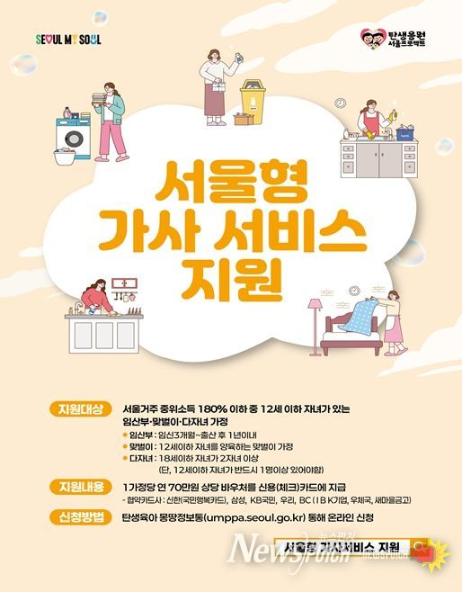 ‘서울형 가사서비스’는 임산부 가정은 안전한 출산에 집중하고, 맞벌이‧다자녀 가정은 아이와 더 많은 시간을 보낼 수 있도록 가사관리사가 가정을 방문해서 청소, 설거지, 빨래 같은 집안일을 도와주는 사업이다. 중위소득 180% 이하 임산부‧맞벌이‧다자녀가정이 가사서비스를 이용할 수 있도록 시가 연 70만 원 상당의 바우처를 지원한다.