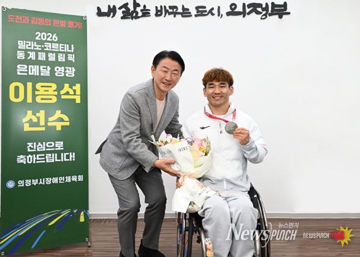 뉴스펀치 박상훈 기자 | 의정부시장애인체육회는 24일 오전 시장실에서 ‘2026 밀라노·코르티나 동계 패럴림픽’ 휠체어 컬링 믹스더블 종목에서 은메달을 획득한 이용석 선수를 초청해 격려식을 개최했다.