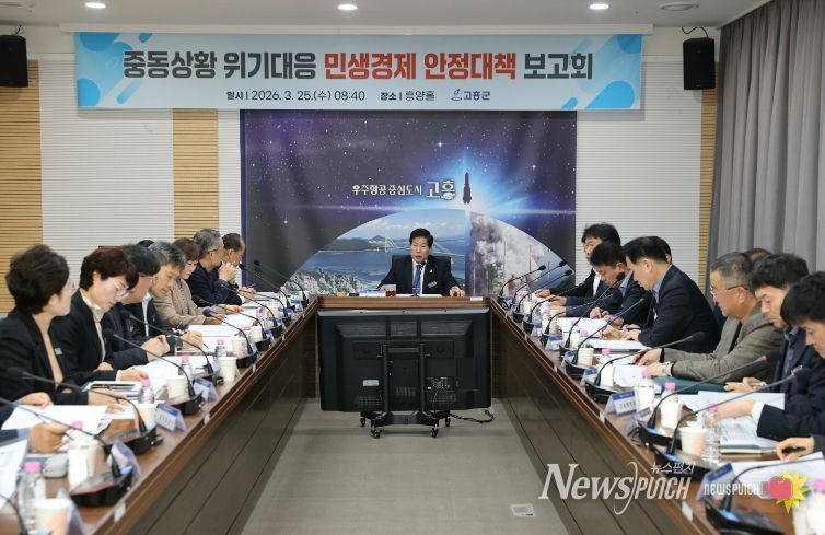 뉴스펀치 김용희 기자 | 고흥군은 25일 군청 흥양홀에서 군수 주재로 각 부서장이 참석한 가운데 ‘중동 상황 위기대응 민생경제 안정대책 보고회’를 개최하고, 최근 중동 상황으로 인한 경제위기 극복을 위한 분야별 대응 방안을 집중적으로 점검했다.