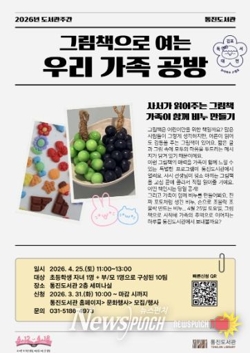 뉴스펀치 박상훈 기자 | 김포시 통진도서관은 제62회 도서관주간을 맞아 오는 4월 25일 오전 11시, ‘그림책으로 여는 우리 가족 공방’을 운영한다.