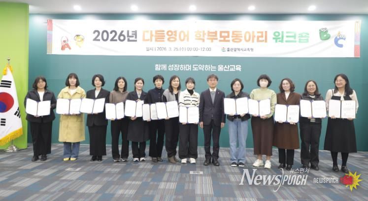 뉴스펀치 김윤걸 기자 | 울산광역시교육청은 25일 외솔회의실에서 ‘2026년 다듣영어 학부모동아리 공동 연수’를 개최하고, 가정 내 아이 중심형 영어 학습 실천 사례를 공유하며 공교육 중심의 영어 교육 활성화 방안을 논의했다.