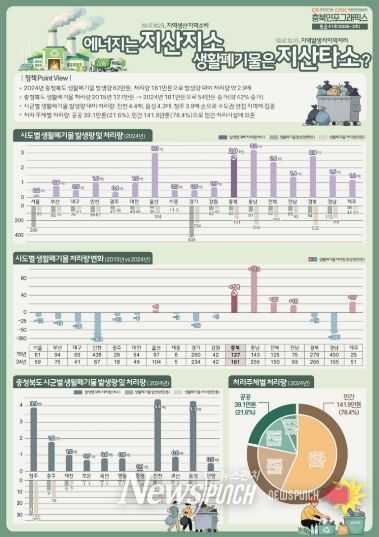 뉴스펀치 이현승 기자 | 충북연구원 충북정책개발센터(센터장 정용일)는 전국 17개 시·도별 생활폐기물 발생량 대비 처리 현황 및 처리량 변화, 충북 도내 11개 시·군지역의 처리현황을 분석한 인포그래픽 '에너지는 지산지소, 생활폐기물은 지산타소?'를 발간했다.