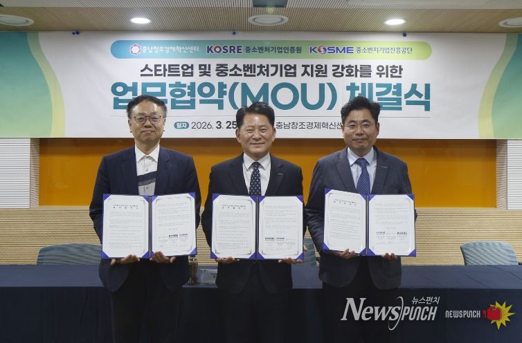 뉴스펀치 이현승 기자 | (재)충남창조경제혁신센터는 25일 중소기업벤처인증원, 중소벤처기업진흥공단 충청연수원과 스타트업 및 중소벤처기업의 성장 지원을 위한 업무협약(MOU)을 체결했다고 밝혔다.