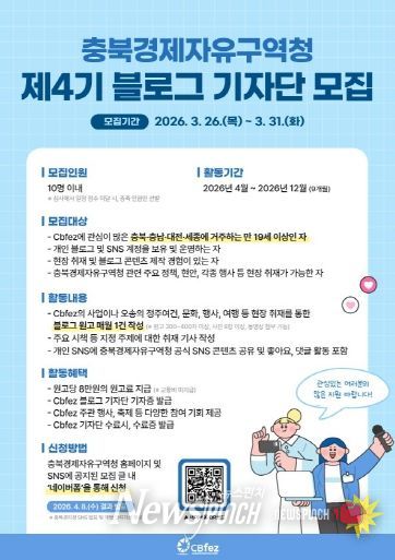 뉴스펀치 이현승 기자 | 충북경제자유구역청은 충북경제자유구역의 역동적인 발전상과 정주 여건을 심도 있게 전달할 ˊ2026년 제4기 블로그 기자단ˊ을 모집한다고 밝혔다.