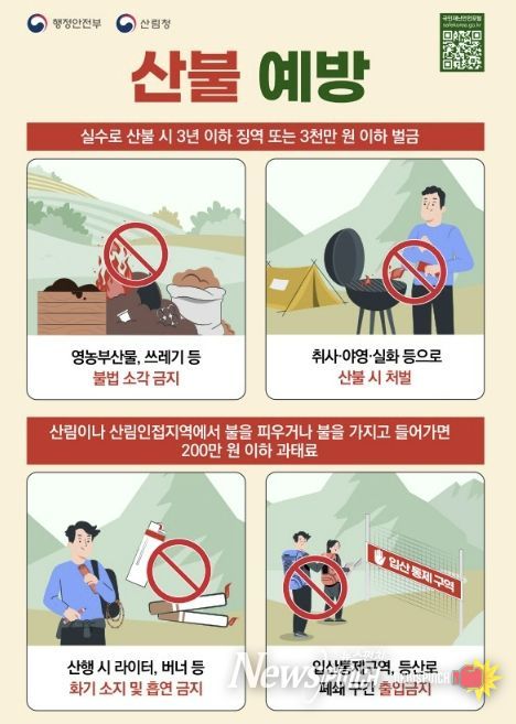 군 관계자는 “산불 발생 시 고의나 과실 여부와 관계없이 엄중 처벌되며, 과실로 산림을 훼손할 경우 3년 이하의 징역 또는 3천만 원 이하의 벌금이 부과될 수 있다”며 “소중한 산림을 지키기 위한 군민들의 적극적인 협조를 부탁드린다”고 말했다.