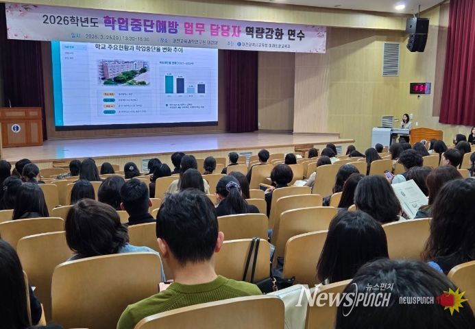 뉴스펀치 이현승 기자 | 대전시교육청은 3월 25일 대전교육과학연구원 대강당에서 관내 초·중·고·특수·각종학교의 학업중단예방 업무담당자를 대상으로 ‘2026학년도 학업중단예방 업무담당자 역량강화 연수’를 개최했다고 밝혔다.