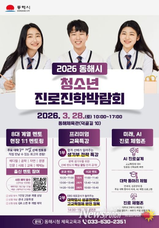 뉴스펀치 조평훈 기자 | 동해시는 오는 3월 28일 오전 10시부터 오후 5시까지 동해체육관에서 ‘2026 동해시 청소년 진로·진학 박람회’를 연다.