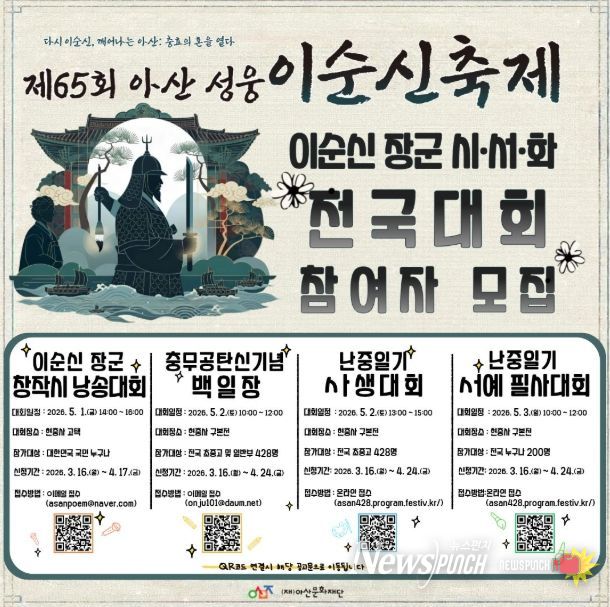 뉴스펀치 이현승 기자 | (재)아산문화재단은 '제65회 아산 성웅 이순신 축제'를 맞아 성웅 이순신 장군의 충효애 정신과 숭고한 뜻을 기리고 계승하기 위한 ‘이순신 장군 시·서·화 전국대회’를 개최하고 전국의 참가자를 모집한다.