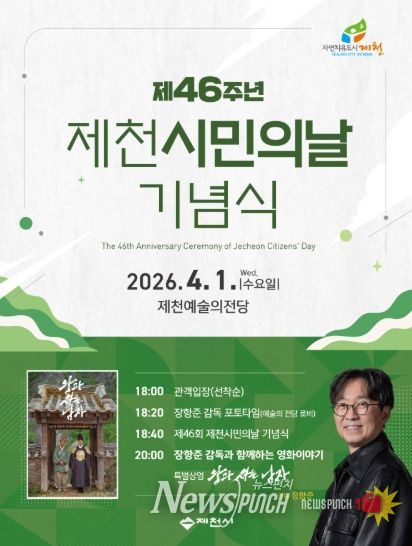 제46주년 제천시민의날 행사는 장항준 감독과의 포토타임, 1부 기념행사, 2부 장항준 감독과의 영화 이야기 및‘왕과 사는 남자’특별상영으로 진행될 예정이다.