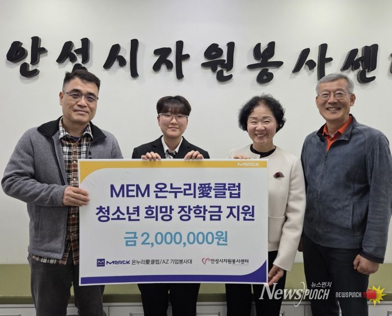 뉴스펀치 박상훈 기자 | 지난 25일, 안성시자원봉사센터는 머크일렉트로닉머티리얼즈㈜ 임직원 봉사단인 ‘머크 온누리愛클럽’과 함께 관내 학생을 위한 ‘희망장학금’ 전달식을 가졌다.