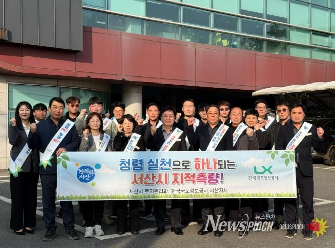 직무교육 후 청렴 교육과 ‘청렴한 서산, 깨끗한 서산’란 표어와 함께 서산시청 직원과 한국국토정보공사 서산지사 직원 간‘청렴 측량 및 토지이동조사 허가증’을 직접 걸어주며 합동 청렴실천 결의대회를 진행했다.