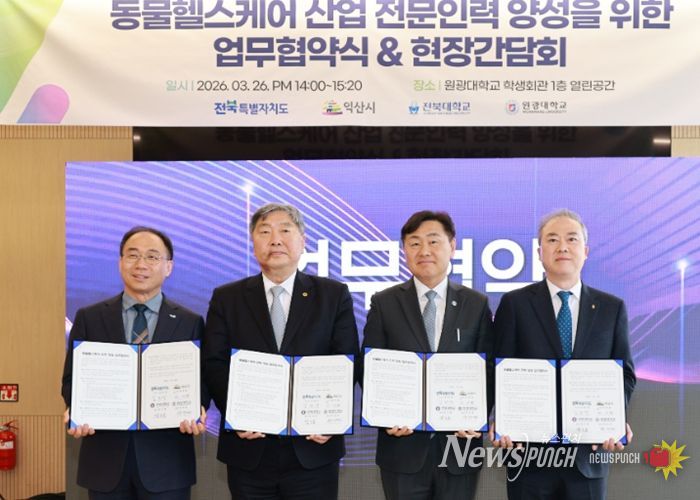 뉴스펀치 정홍균 기자 | 김관영 전북특별자치도지사가 26일 원광대학교에서 ‘동물헬스케어 전문인력 양성을 위한 현장간담회’를 갖고, 전북대학교·원광대학교·익산시와 함께 산·학·관 협력 기반 구축을 위한 업무협약을 체결했다.