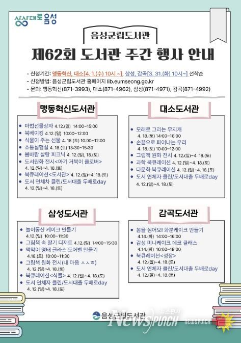 뉴스펀치 이현승 기자 | 음성군립도서관(맹동혁신,대소,삼성,감곡)에서는 제62회 도서관 주간을 맞이해 오는 4월 12일부터 ‘도서관 속 작은 펼침, 세상을 여는 큰 열림’이라는 주제로 음성군립도서관 이용자 대상 각종 독서·문화 행사를 개최한다.