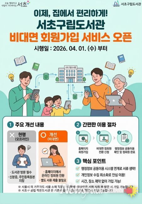 뉴스펀치 박상훈 기자 | 서울 서초구는 4월 1일부터 서초구립도서관에 비대면 회원가입 서비스를 도입해 본격 시행한다고 밝혔다. 기존에는 홈페이지에서 회원가입을 하더라도 도서 대출이나 희망도서 신청 등이 가능한 정회원이 되려면 반드시 서울시민임을 확인할 수 있는 신분증이나 주민등록등본을 지참하고 도서관을 직접 방문해야 했다.