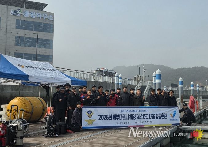 뉴스펀치 박상훈 기자 | 경기평택항만공사가 봄철 해양레저 성수기를 앞두고 도민이 안심하고 즐길 수 있는 바닷길을 만들기 위해 26일 화성시 제부마리나항에서 ‘2026년 제부마리나 합동 해양재난사고 대응훈련’을 실시했다.