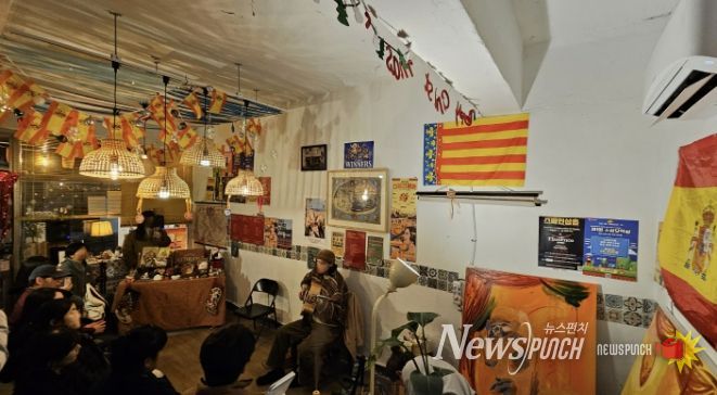 골목에 위치한 작은 가게에는 스페인 국기 가랜드와 FC바르셀로나 팀기, 각종 모임과 공연 포스터, 감각적인 유화작품들이 여기저기 걸려있다. 제멋대로인 듯 일종의 규칙과 문화를 품고 있는 공간을 보고 있노라면 주인장의 정체가 궁금해진다.